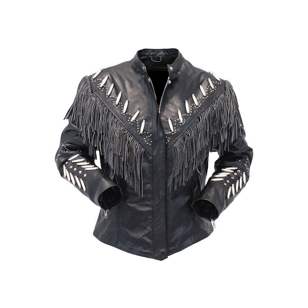 Black Western Fringe Leather Jacket with Bone Beads Work