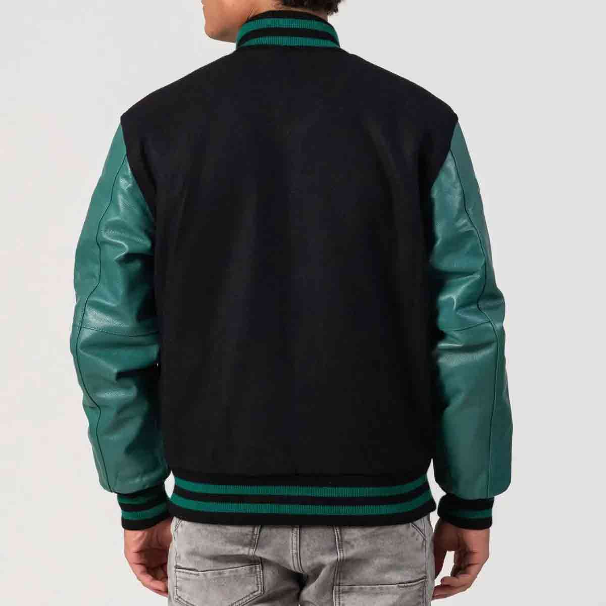 Stand out effortlessly in the Black Wool & Teal Leather Sleeves Letterman Jacket, a striking blend of timeless varsity design and modern color contrast. The deep black wool body delivers a sleek, confident look, while the vibrant teal leather sleeves add a fresh, eye-catching edge. Perfect for casual wear, campus life, or street-style outfits, this jacket brings personality and polish to any wardrobe.