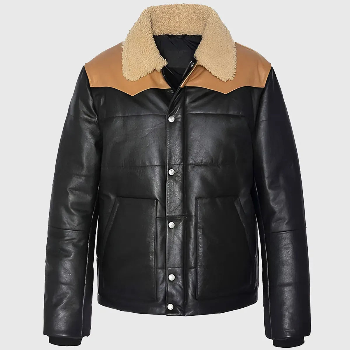 Dual Tone Black Leather Puffer Jacket with Shearling Collar