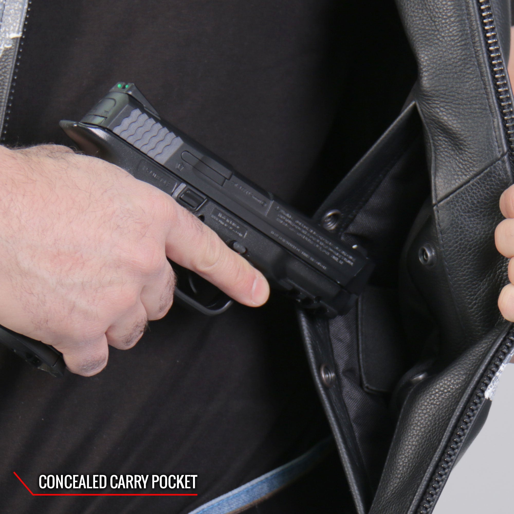 The Hot Leathers Club Style 'Jumbo Skull' Vest with Concealed Carry is a stylish and functional choice for motorcycle riders. This vest features a club-style design with a large skull graphic, adding a bold and edgy aesthetic. Additionally, it comes with concealed carry pockets, providing riders with a discreet and secure way to carry their firearms while on the road. The combination of style and practicality makes this vest a popular option among bikers looking for both fashion and functionality.