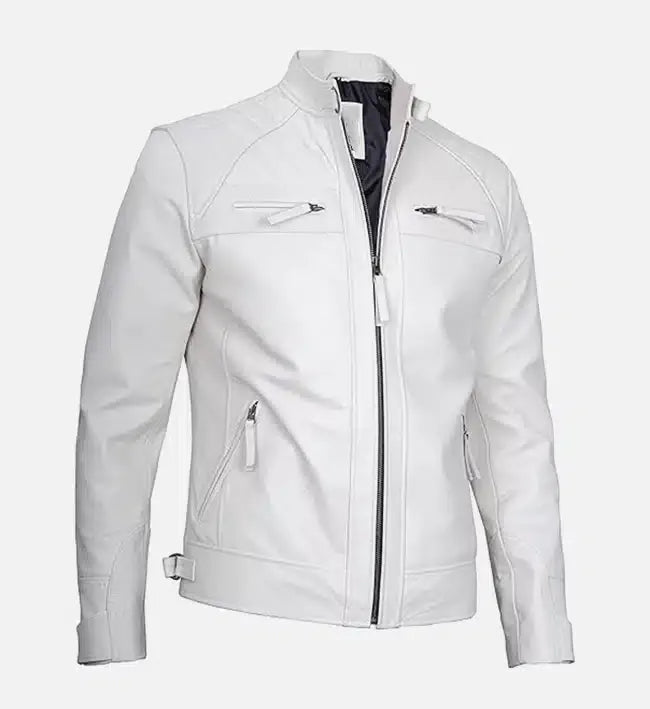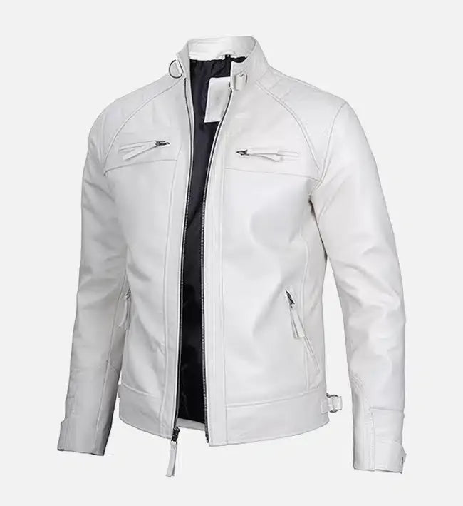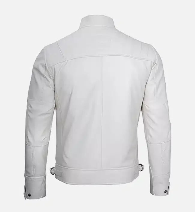 Designed for both fashion and function, this men’s leather cafe racer jacket features a front zip closure, stand-up collar, and precision-cut panels that create a flattering, masculine silhouette. Practical zippered pockets provide secure storage, while reinforced seams ensure long-lasting performance. The sleek white leather finish delivers a modern statement look that transitions seamlessly from day to night.